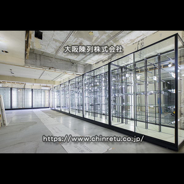 法人のお客様 042 大阪ミナミの歴史有る有名演劇場様への「グッズ展示販売用ショーケース(グッズ陳列ケース)」としてのアルミ枠ガラスショーケースの製作販売実例(通販可) |