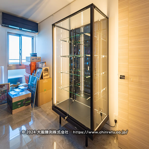 個人のお客様 057 「フィギュア/スタチュー展示用コレクションケース」としての高性能LED照明付き「前面フレームレス仕様」アルミ枠ガラスショーケースの製作販売実例(通販可) |