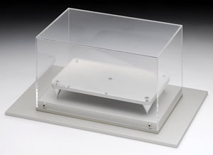 カバーには3mm厚の透明アクリル板を使用。 5mm/10mm厚のアルミ板にブラスト処理を施し、アルマイト加工したものをベースに使用。 テーブルには5mm厚のアルミ板/アクリル板に、アルミ棒を円錐形にNC加工した脚を取り付け、中央からベースに固定。