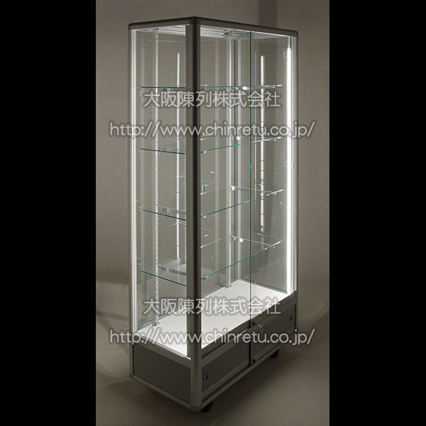 葬儀関連会社様(セレモニーホール様)からご依頼を頂いておりました「アルミ枠ガラスショーケース」の製作販売実例です。 このタイプはご家庭用コレクションケースとしても人気がございます。 デラックスタイプのアルミ枠ガラスショーケースの両サイドに1灯ずつ「LED照明」を縦方向に取り付けております。 見た目は細型蛍光管とよく似ておりまして、(LED素子の粒々が見えずに)器具全体が蛍光灯の様に明るく光ります。 アルミ枠の色は写真のシルバー以外に、ブラックもご用意出来ます。 ガラス棚板は25mmピッチで高さの変更が出来ますし、着脱も容易に出来ます。 ガラスケース部分には標準でプッシュ錠が付属致しております。 標準でキャスターが付属致しておりますので、ちょっとした配置替えの際にも非常に便利です。 外寸(およそ):W900×D450×H1,850mm |